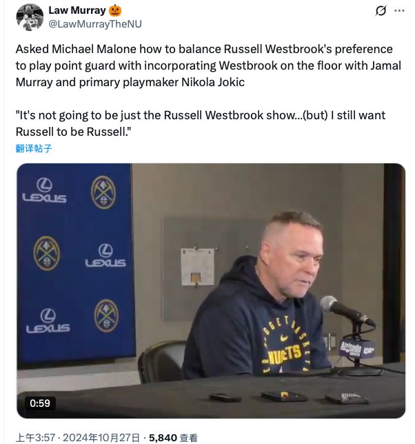 2024年休賽期,威少加盟掘金,賽季初的一次新聞發(fā)布會上,球隊(duì)主帥馬龍談到威少與約基奇、穆雷如何共存時(shí)表示:“這不會變成威少的個(gè)人秀……我依然希望威少做自己?!?/p>