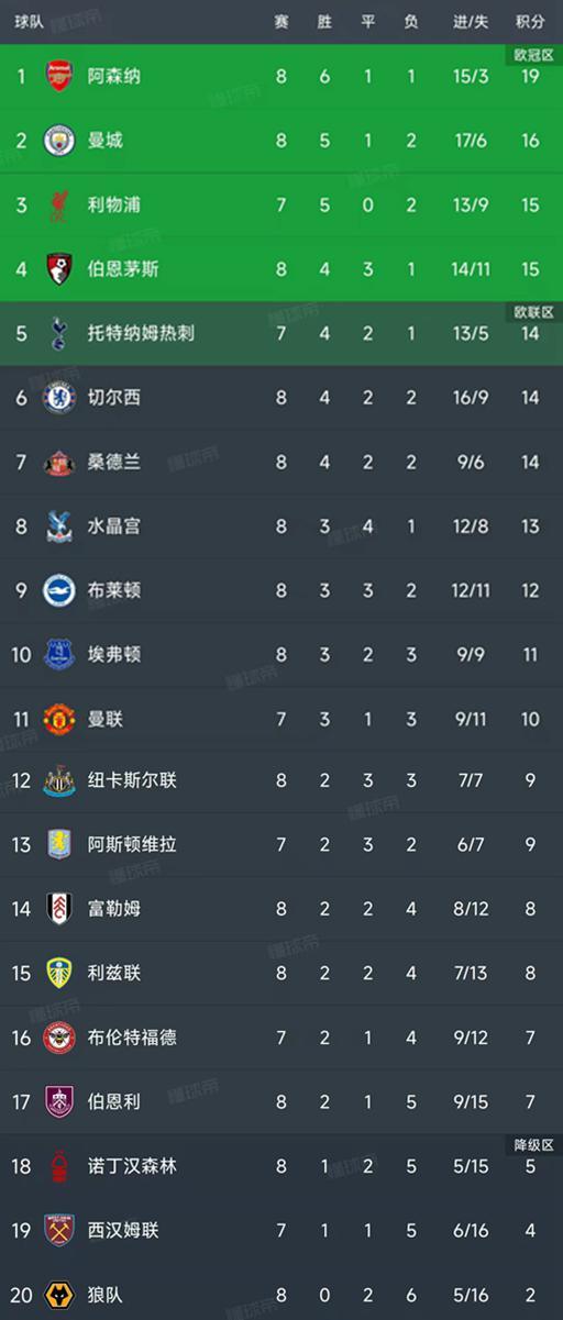 北京時(shí)間10月19日,英超第8輪結(jié)束了7場比賽,最新積分榜如下!